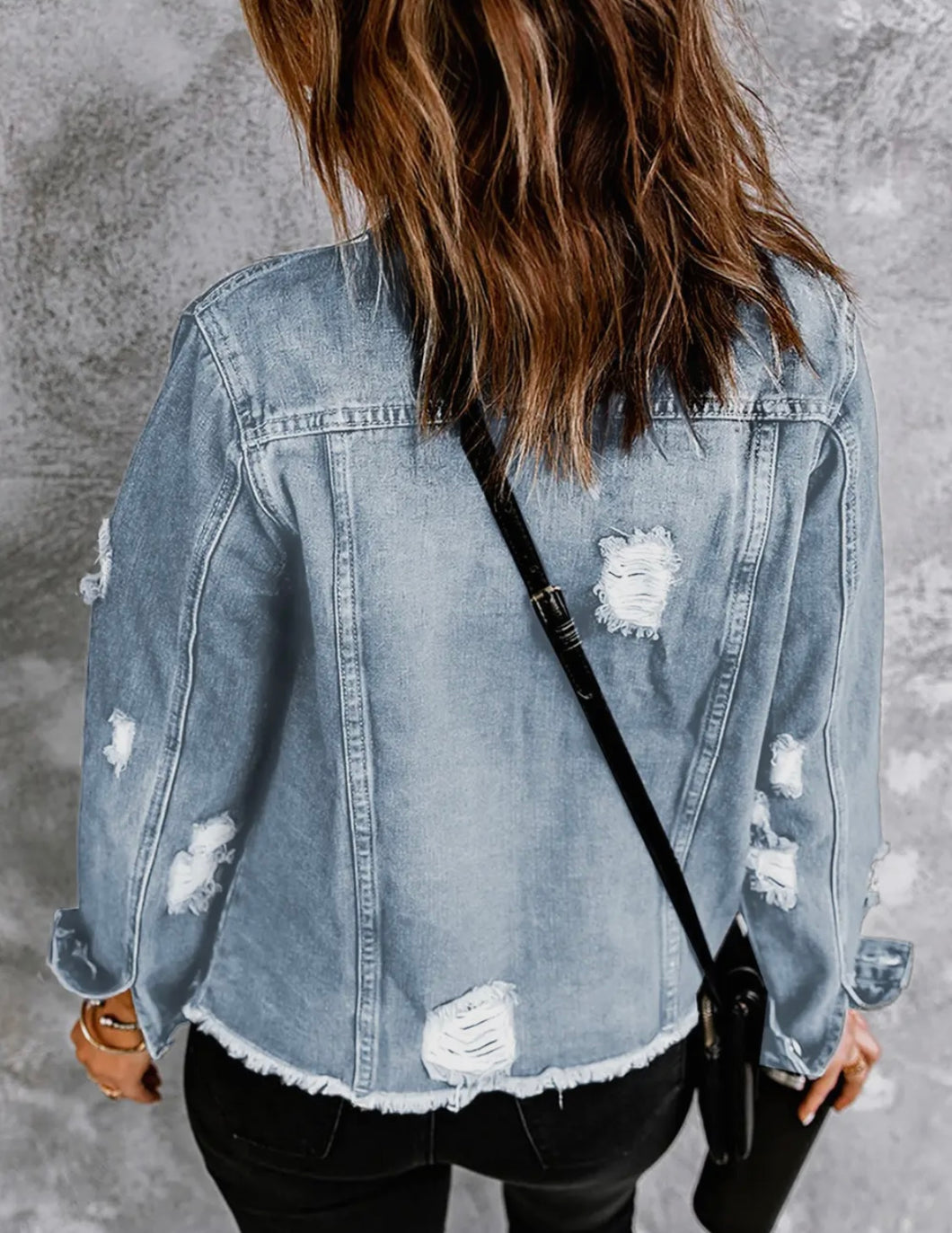 This super cute, distressed raw hem denim jacket is a must for your closet!